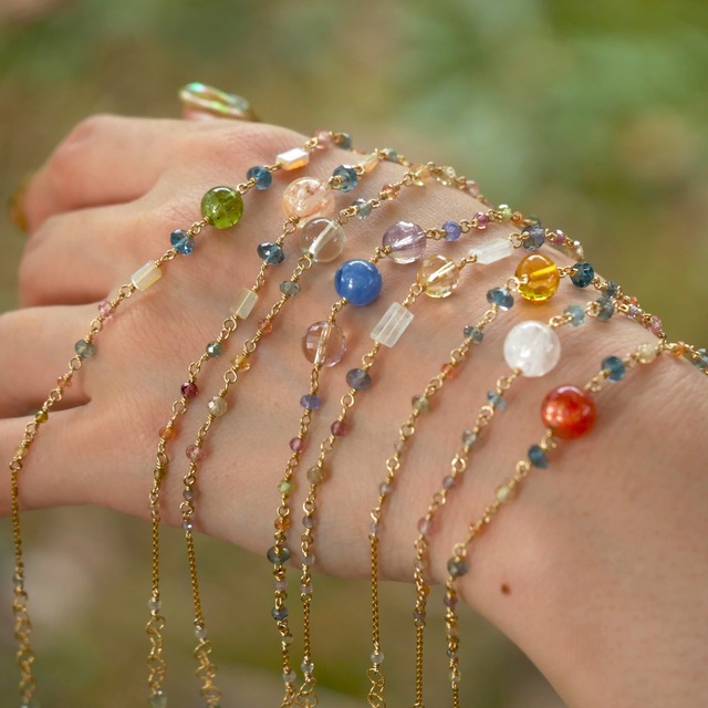 まるで木の葉に水滴が落ちた様な、 透明感があって、みずみずしい 自然の美しさに触れた感覚にさせてくれます。 ツァボライトやオパールなどを使った優しい色味のブレスレットで、見ているとほっこりして癒されます。 グレーのシアーニットにデニムで海に出掛けたくなる爽やかコーデ 黒のワンピースとパールのネックレスと合わせて 透明感をプラスして シンプルさと存在感も両方欲しい方にもピッタリのジュエリーになっています。 素材:14kgf カラーストーン:ツァボライト、レモンクウォーツ、オパールなど 全長約15㎝ アジャスター2㎝