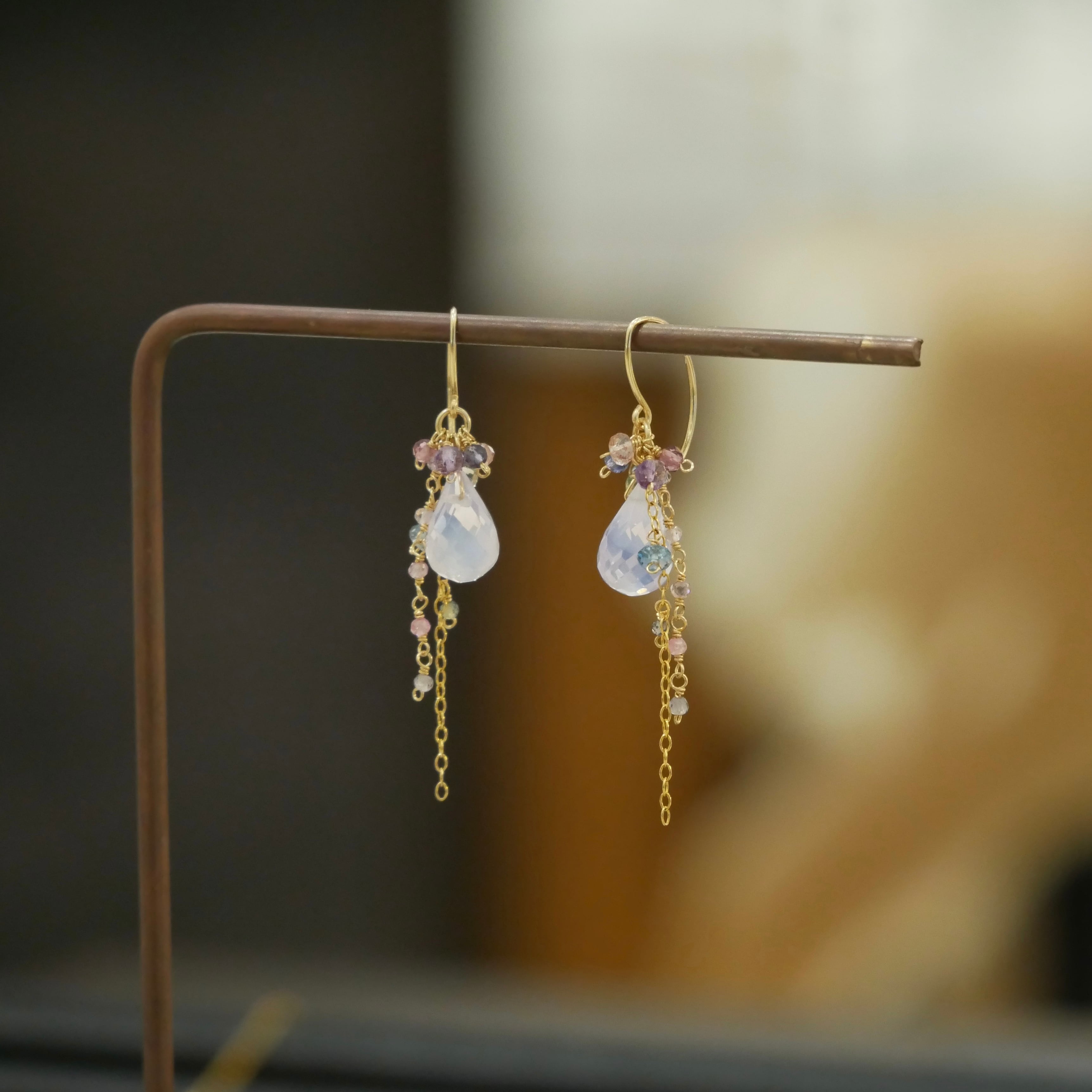 綺麗なミルキーピンクに暖かみのあるカラーストーンが耳元でさり気なく揺らめきます。